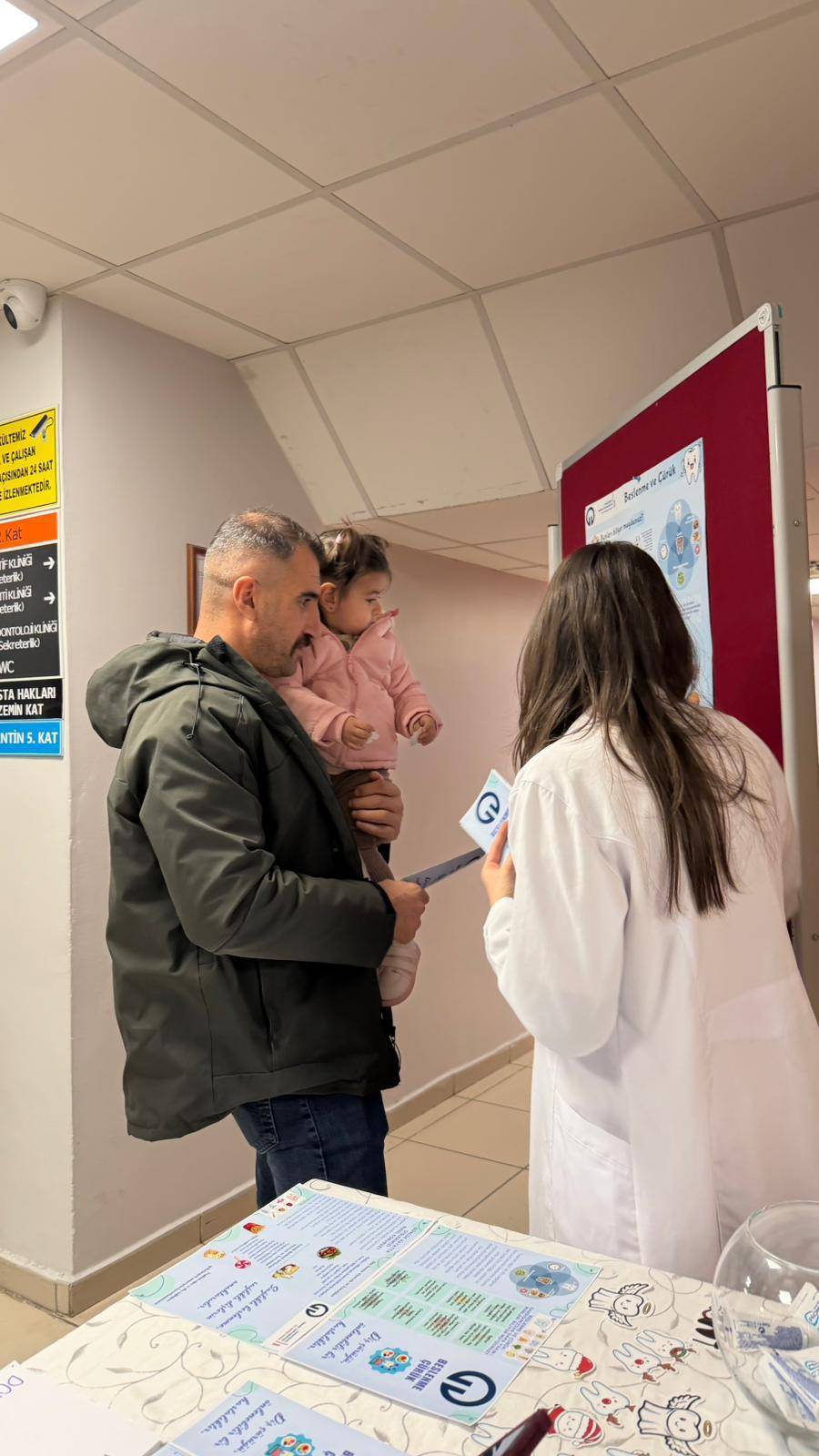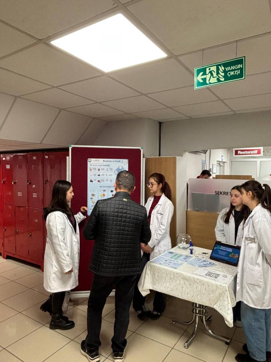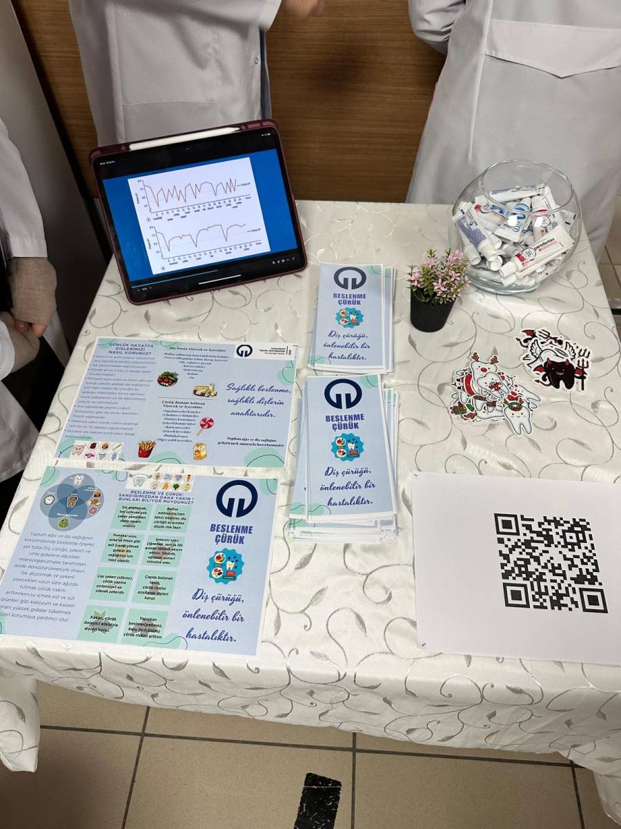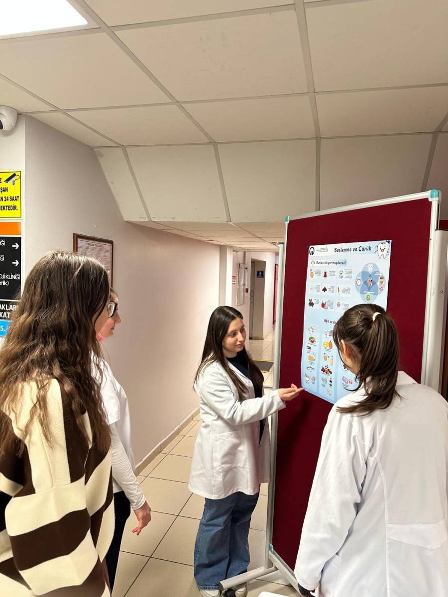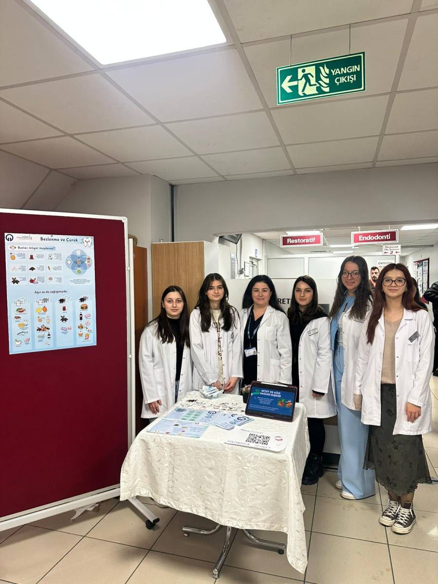 Etkinlik kapsamında öğrencilerimiz Beyza Pamuk, Yağmur Özmen, Hüsna Kevser Mercan, Bengisu Yılmaz ve Sümeyye Karal tarafından, Restoratif Diş Tedavisi ve Endodonti Anabilim Dalları hasta bekleme alanında kurulan bilgilendirme standı aracılığıyla hastalara yönelik olarak beslenme alışkanlıklarının diş çürüğü oluşumu üzerindeki etkileri, çürükten korunma yolları ve ağız sağlığının korunmasında doğru beslenmenin önemi hakkında bilgilendirmeler yapıldı.