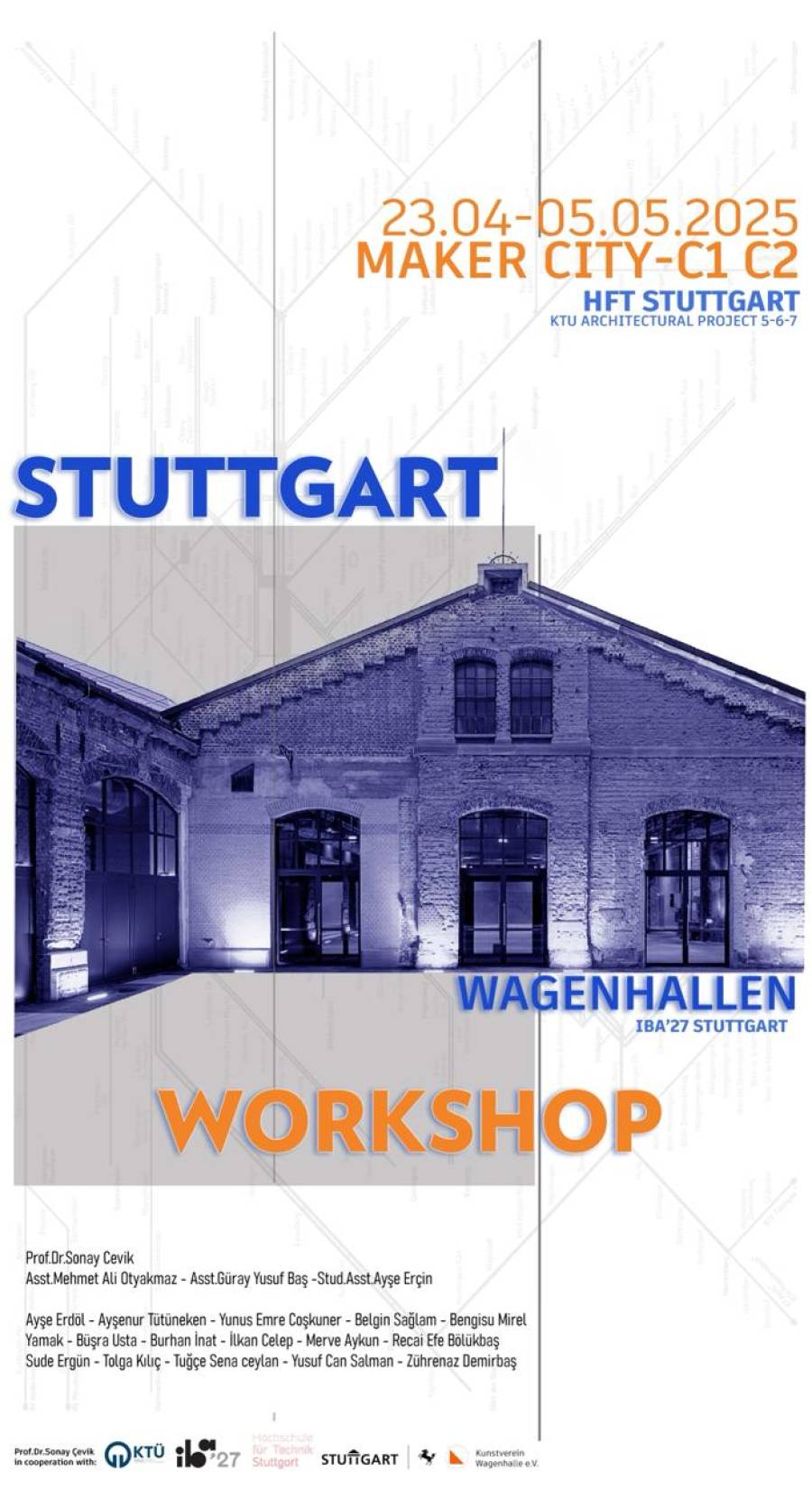 Prof. Dr. Sonay Çevik, Arş. Gör. Güray Yusuf Baş ve Arş. Gör. Mehmet Ali Otyakmaz Mimari Proje, 6-5 ve Mimari Proje 7 Dönem Proje Grupları ile "IBA'27 Stuttgart Kapsamında, Wagenhallen C1-C2/ Proje Alanında Kent Tasarımsal Ödevler kapsamında Stuttgart’ta bir çalıştay gerçekleştirmişlerdir.