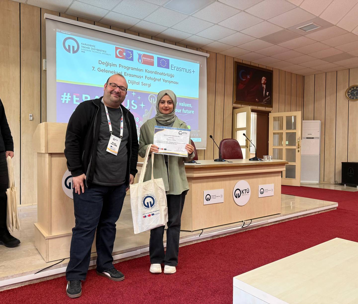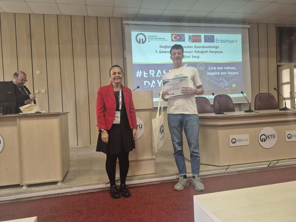 Bu yıl da hem dünyanın farklı ülkelerindeki hem de ülkemizdeki diğer üniversiteler ile eş zamanlı olarak, Üniversitemiz Değişim Programları Koordinatörlüğü’nün organizasyonuyla KTÜ Erasmus Günleri 2025 etkinlikleri 13-14-15 Ekim 2025 tarihlerinde düzenlendi. Etkinlikler kapsamında ayrıca 7. Geleneksel Erasmus+ Fotoğraf Yarışması düzenlendi. Yarışmada daha önce Erasmus+ programından faydalanmış öğrencilerin fotoğrafları yarıştı. Etkinliğin birinci gününde yarışmaya katılım sağlayan öğrencilerin fotoğrafları dijital sergi olarak Koordinatörlüğümüzün sosyal medya hesaplarında paylaşıldı. Etkinliğin ikinci gününde oylama sonucu ilk üçe giren fotoğrafların sahibi öğrencilerimiz için Fen Fakültesi Nazım Terzioğlu Amfisi'nde ödül töreni düzenlendi. Dereceye giren öğrencilerimize hediyeleri Dış İlişkiler Genel Koordinatörü Prof. Dr. Sercan EROL ve Değişim Programları Koordinatörlüğü ekibi tarafından takdim edildi. Ödül töreninin ardından Değişim Programları Koordinatörlüğü tarafından Erasmus+ Öğrenci Öğrenim ve Staj Hareketliliği programları hakkında bilgilendirme toplantısı düzenlendi. Etkinliğin son gününde daha önce Erasmus+ programından faydalanmış öğrencilerimiz deneyimlerini anlatan sunumlar gerçekleştirdiler ve Erasmus Student Network'ün KTÜ'deki temsilcisi olan ESN Trabzon tarafından ESN öğrenci topluluğunu tanıtan bir sunum gerçekleştirildi. Etkinliklere ve fotoğraf yarışmasına katılan tüm öğrencilerimize teşekkür ederiz.