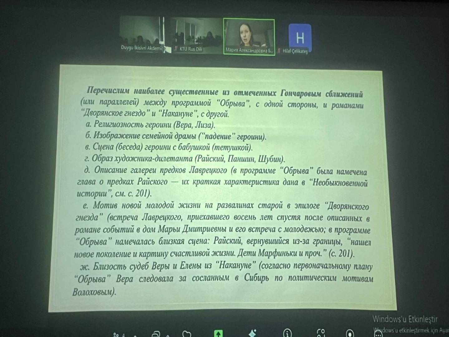 Seminerin konuğu, M. V. Lomonosov Moskova Devlet Üniversitesi Dr. Öğr. Üyesi Mariya Aleksandrovna BOROZDİNA oldu. Dr. BOROZDİNA, İvan Aleksandroviç GONÇAROV'un biyografisinden yola çıkarak yazarın sanat hayatına şiirle adım atışını ve edebi gelişimini detaylarıyla anlattı. Yazarın farklı coğrafyalara gerçekleştirdiği seyahatler hasebiyle başyapıtı Oblomov'un yazım sürecinin uzun yıllara yayıldığı vurgulandı.
