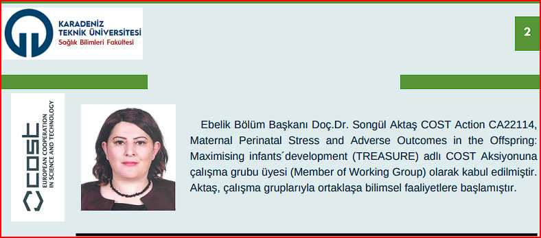 Ebelik Bölüm Başkanı Doç. Dr. Songül AKTAŞ, CA18211 - Perinatal Mental Health and Birth-Related Trauma: Maximising best practice and optimal outcomes adlı COST Aksiyonunda, çalışma grubu üyeleriyle (Uluslararası 15 farklı üniversiteden araştırmacılarla) ortaklaşa hazırladıkları makale, Q2 kategorisinde bir dergide yayınlamıştır. İlgili çalışmada Türkiye’den Aktaş ile birlikte, Doç.Dr. Ruveyde AYDIN (19 Mayıs Ünversitesi) yazar olarak yer almıştır. Bu COST aksiyonu kapsamında Aktaş, 20-23 Şubat 2023 tarihleri arasında Belçika’nın Leuven üniversitesinde düzenlenen “doğum travması” konulu eğitim programına yüz yüze katılım göstermiştir.