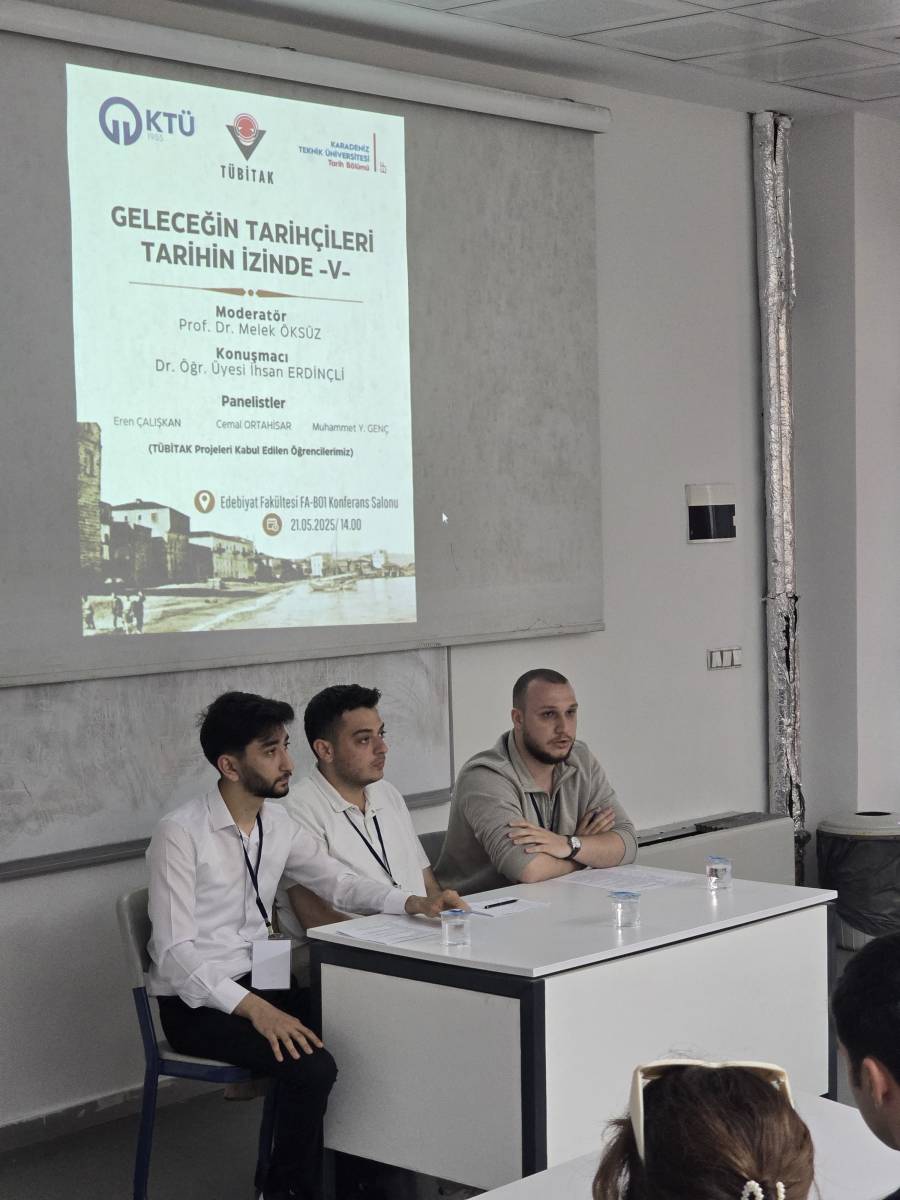 KTÜ Tarih Bölümü ve KTÜ Tarih Kulübü ortaklığında "Gençlerin Gözünden 19 Mayıs ve Gençlik" isimli panel, Prof. Dr. Hikmet ÖKSÜZ'ün moderatörlüğünde Yunus Emre AKYÜZ'ün "1876'dan 1919'a Milli Mücadeleye Giden Süreç", Mehmet Ali KARATEPE'nin " Milli Mücadele Dönemi" ve Eren ÇALIŞKAN'ın "Atatürk'ün Kaleminden Milli Mücadele (Nutuk)" başlıklı konuşmaları ile 16 Mayıs 2025 Cuma günü saat 14.00'da Edebiyat Fakültesi Konferans Salonu'nda gerçekleştirilmiştir.