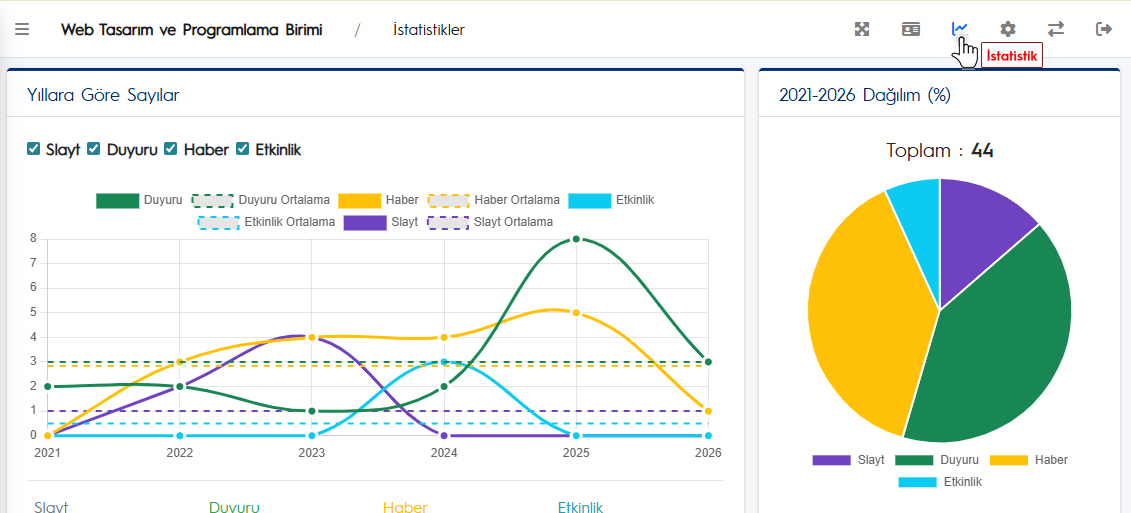 Birimlerimizin içerik üretim ve kullanım verilerini daha etkin şekilde takip edebilmesi amacıyla Web Yönetim Sistemi (WYS) içinde aşağaki görselde görünen İstatistik Sayfası kullanıma açılmıştır.