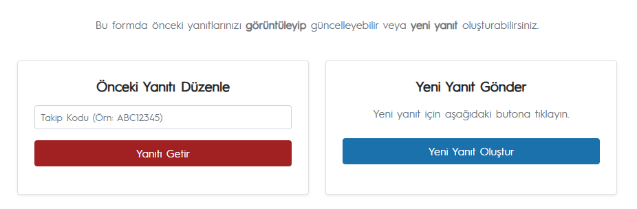Kullanıcıya şu mesaj iletilir: “Yanıtınız başarıyla kaydedilmiştir! Teşekkür ederiz. Yanıtınızı düzenlemek için takip kodu: ‘…….’ Lütfen bu kodu saklayınız.”