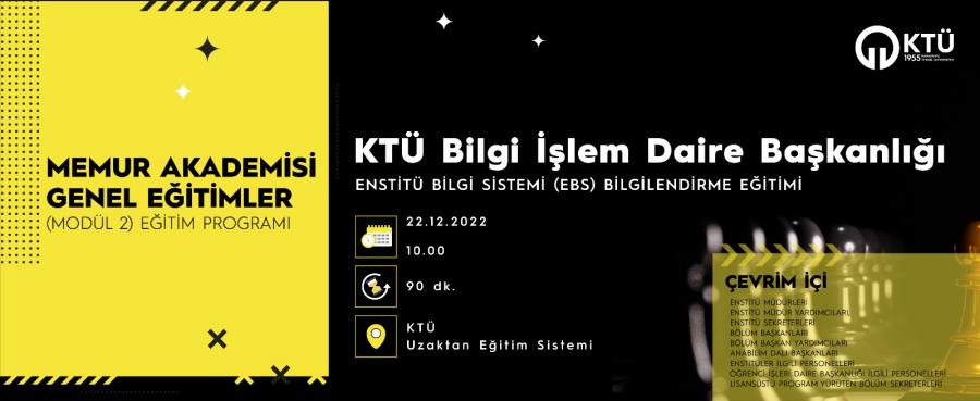 Enstitülerin, anabilim dallarının ve lisansüstü öğrencilerinin, lisansüstü eğitim ile ilgili tüm iş ve işlem süreçlerinin yürütülmesini ve takibini sağlamak üzere tasarlanan “Enstitü Bilgi Sistemi (EBS)” yazılımının tüm paydaşlara tanıtımı ve ön eğitim sürecinin gerçekleştirilmesi amacıyla 22.12.2022 tarihinde saat 10.00'da KTÜ Uzaktan Eğitim Sistemi aracılığı ile Çevrim İçi eğitim verilecektir.