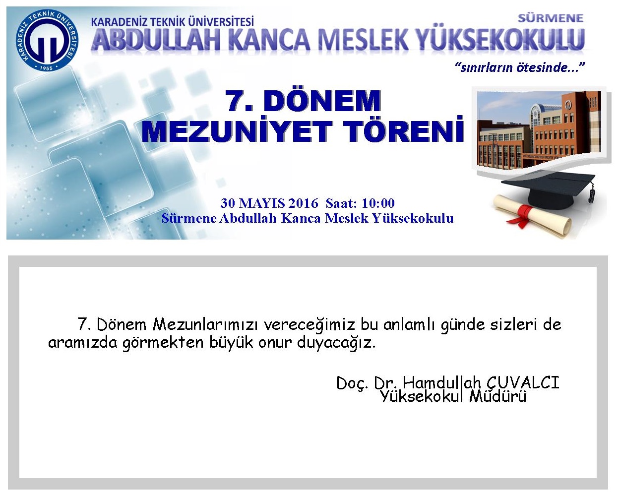 7. Dönem Mezuniyet Törenimiz, 30 Mayıs 2016 Pazartesi günü, Saat 10:00'da Meslek Yüksekokulumuzda gerçekleştirilecektir.