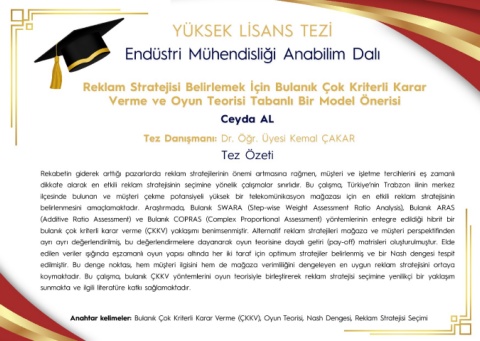 Anahtar kelimeler: Bulanık Çok Kriterli Karar Verme (ÇKKV), Oyun Teorisi, Nash Dengesi, Reklam Stratejisi Seçimi