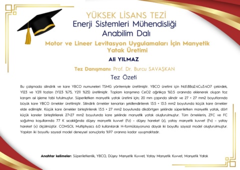 Anahtar kelimeler: Süperiletkenlik, YBCO, Düşey Manyetik Kuvvet, Yatay Manyetik Kuvvet, Manyetik Yatak