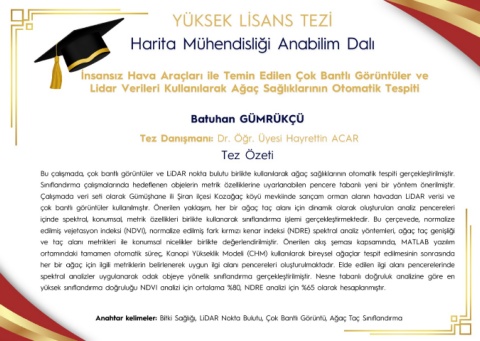 Anahtar kelimeler: Bitki Sağlığı, LiDAR Nokta Bulutu, Çok Bantlı Görüntü, Ağaç Taç Sınıflandırma