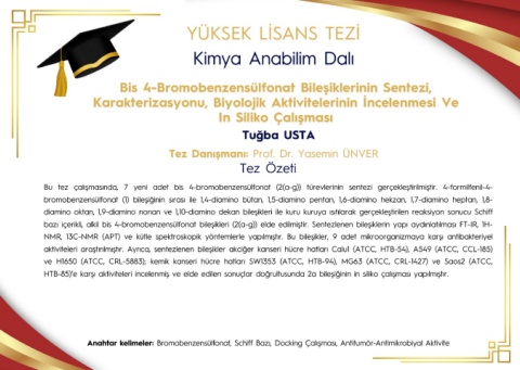 Anahtar kelimeler: Bromobenzensülfonat, Schiff Bazı, Docking Çalışması, Antitumör-Antimikrobiyal Aktivite