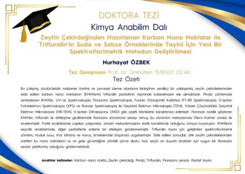 elde edilen karbon nano noktaların (KNN’lerin) trifluralin pestisitinin tayininde kullanılmasını ele almaktadır. Piroliz yöntemiyle