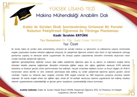 Anahtar kelimeler: Kablo İle Sürülen Paralel Robot (KSPR), Pekiştirmeli Öğrenme (PÖ), Yol Planlama, Tut-Yerleştir