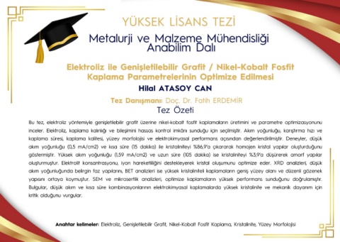 Anahtar kelimeler: Elektroliz, Genişletilebilir Grafit, Nikel-Kobalt Fosfit Kaplama, Kristalinite, Yüzey Morfolojisi
