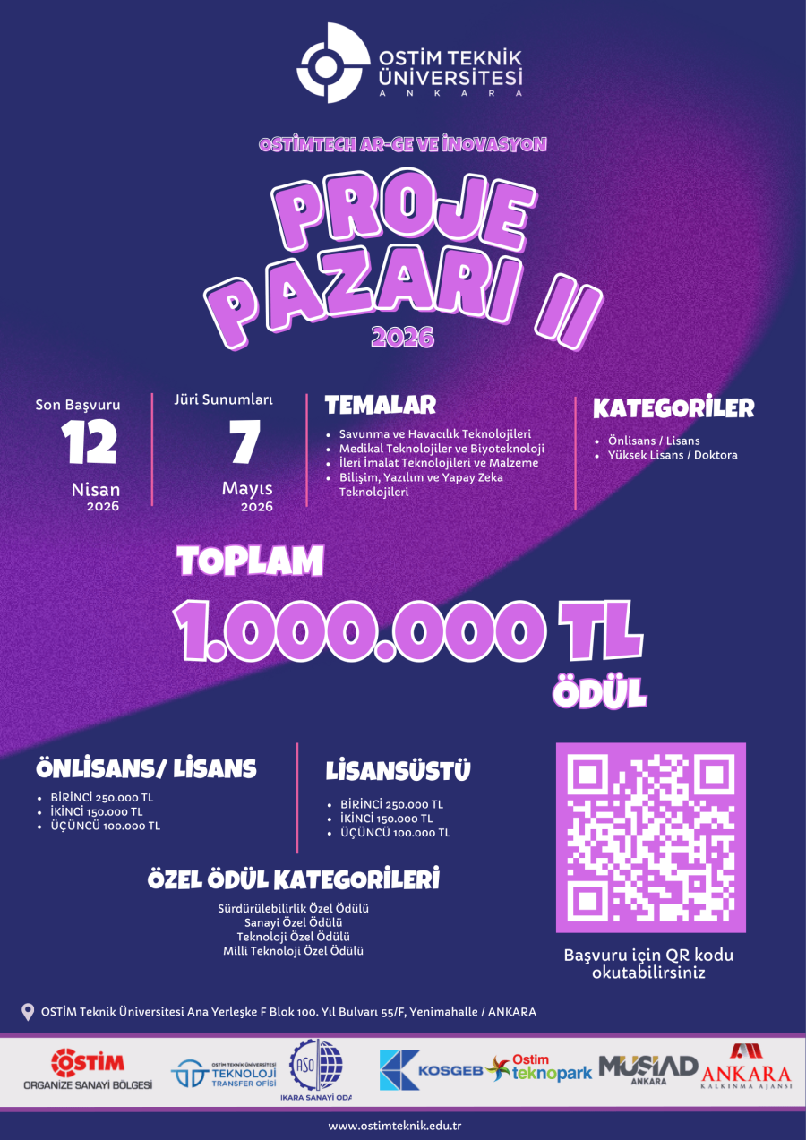 Ostim Teknik Üniversitesi Teknoloji Transfer Ofisi (OSTİMTech TTO) koordinasyonunda, üniversite-sanayi iş birliğini güçlendirmek, yenilikçi fikirlerin desteklenmesini sağlamak ve araştırma çıktılarının ekonomik değere dönüşmesine katkı sunmak amacıyla düzenlenen “OSTİMTech Ar-Ge ve İnovasyon Proje Pazarı II” etkinliği kapsamında jüri sunumları 7 Mayıs 2026 tarihinde OSTİM Teknik Üniversitesi Ana Yerleşkesi’nde gerçekleştirilecektir.