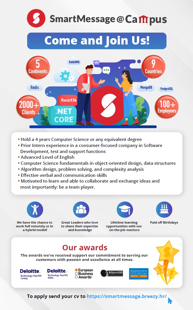 SmartMessage firması Nisan ayında bölümümüzü sanal olarak ziyaret edip ayrıca görüşme gerçekleştirecekler. Tüm mezunlarımıza ve bu dönem sonunda mezun durumda olacak öğrencilerimize duyurulur. Firmanın işe alım programının detaylarına buradan erişebilirsiniz.