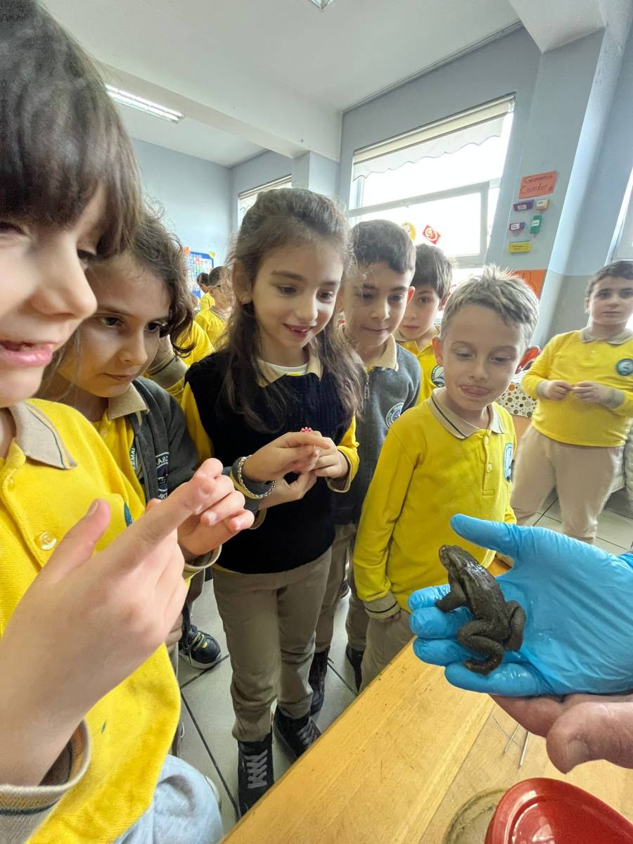 Etkinlikte kurbağa, semender, kertenkele ve yılan gibi hayvanlar öğrencilere tanıtılarak, bu canlıların doğal yaşam alanları ve ekosistemdeki rolleri hakkında bilgiler paylaşılmıştır. Çocuklar, bu hayvanları yakından görme ve merak ettikleri soruları sorma fırsatı bulurken, doğaya zarar vermeden canlıları tanımanın ve korumanın önemi vurgulanmıştır. Sunum boyunca öğrencilerin ilgisi ve heyecanı dikkat çekmiştir.