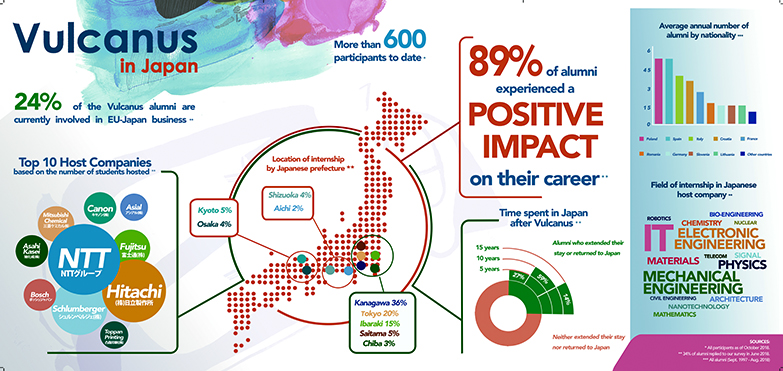 Japonya'daki Vulcanus programı 1997 yılında başlatılmıştır. Program mühendislik, bilim, teknoloji ve matematikle ilgili alanlardaki öğrencilere Japonya'daki şirketlerde eğitim ve endüstriyel staj fırsatları sunmaktadır. Program, Ağustos 2026'da başlayıp Mart 2027'de sona erecektir. (Toplam süre: 8 ay)