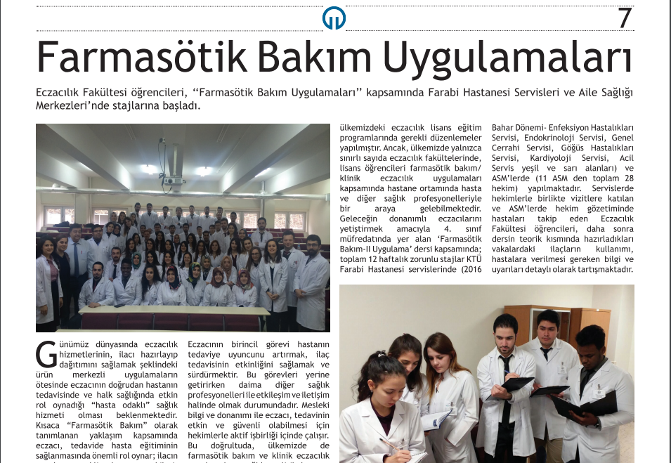 Bu kapsamda geleceğin donanımlı eczacılarını yetiştirmek amacıyla 4. sınıf müfredatında yer alan ve eczacılık fakültesi Farmakoloji Anabilim Dalı’nın hazırladığı ‘Farmasötik Bakım-II Uygulama’ dersi kapsamında;  toplam 12 haftalık zorunlu stajlar KTÜ Farabi Hastanesi servislerinde (2016 Bahar dönemi- Enfeksiyon Hastalıkları Servisi, Endokrinoloji Servisi, Genel Cerrahi Servisi, Göğüs Hastalıkları Servisi, Kardiyoloji Servisi, Acil Servis yeşil ve sarı alanları) ve ASM’lerde (11 ASM den toplam 28 hekim) yapılmaktadır. Servislerde hekimlerle birlikte vizitlere katılan ve ASM’lerde hekim gözetiminde hastaları takip eden eczacılık fakültesi öğrencileri, daha sonra dersin teorik kısmında hazırladıkları vakalardaki ilaçların kullanımı, hastalara verilmesi gereken bilgi ve uyarıları detaylı olarak tartışmaktadır.