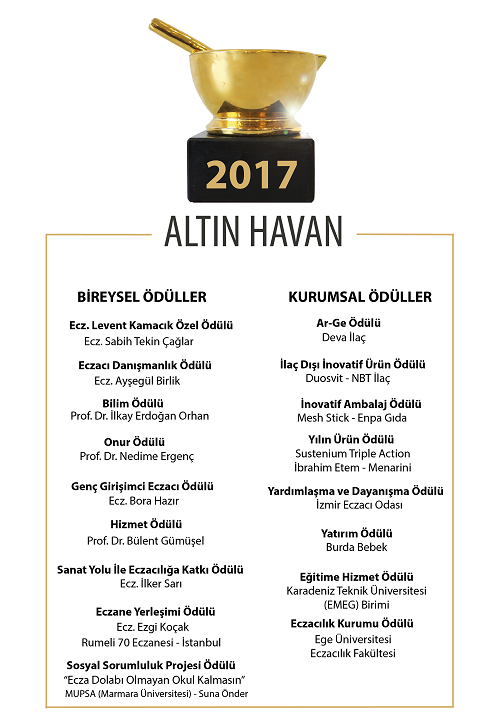 Eczacılık sektörünün en prestijli ödülleri olarak kabul edilen Altın Havan Ödülleri, Eczacı Dergisi'nin organizasyonu olarak 2010 yılından itibaren düzenlenmektedir. Bu ödüllerin amacı ilaç ve eczacılık sektörünün birbirini tamamlayan tüm birimlerinin çalışmalarını ve hizmetlerini değerlendirerek sektörün duayenlerinden oluşan güçlü bir juriyle yetkinliklerini belgeleyerek çalışmalarına güç katmak ve yetişmekte olan kuşakları özendirmek ve geçmişte katkıları olanlara bir vefa örneği sunmaktır.