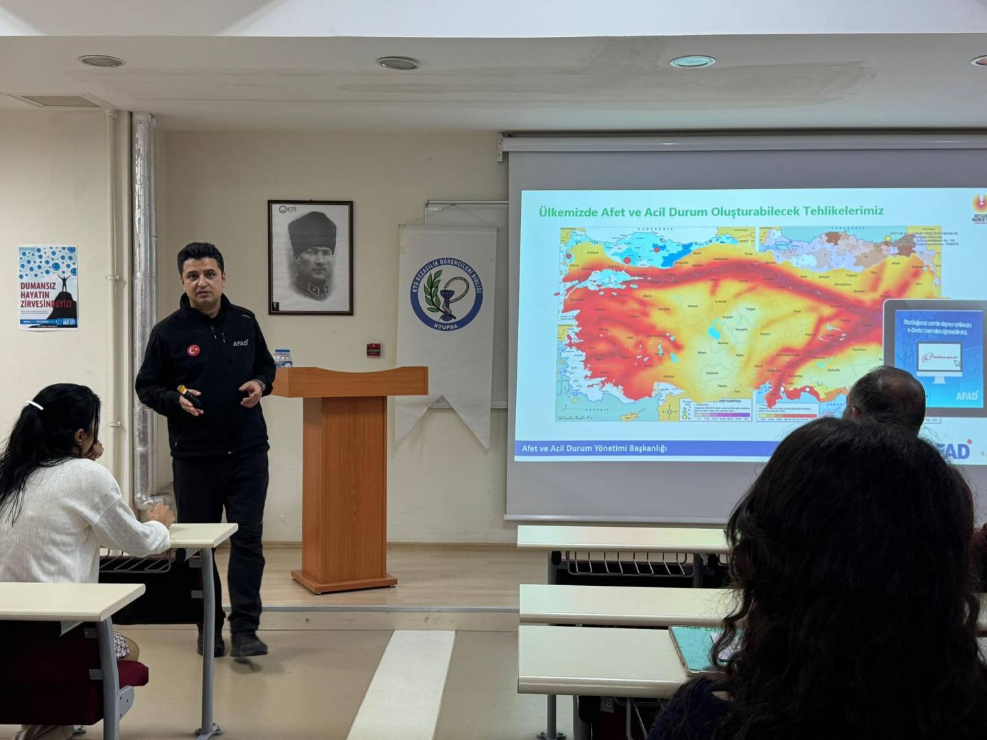 Fakültemiz öğrenci birliği KTUPSA iş birliğinde 24 Aralık 2025 tarihinde 18. Bölge Trabzon Eczacı Odası Başkanı sayın Ecz. Erhan BAŞER'in katılımlarıyla "Afet Yönetimi ve Eczacının Rolü" başlıklı etkinlik düzenlendi. Etkinlik kapsamında Trabzon İl Afet ve Acil Durum Müdürlüğü Eğitim Şube Müdürü Sayın Tolga MMUSLU ve AKUT Trabzon Ekip Lideri Ecz. Köksal OFLUOĞLU, afet bilinci ve afet durumlarında eczacıların üstlenebileceği kritik roller üzerine değerli bilgi ve deneyimlerini öğrencilerimizle paylaştılar.