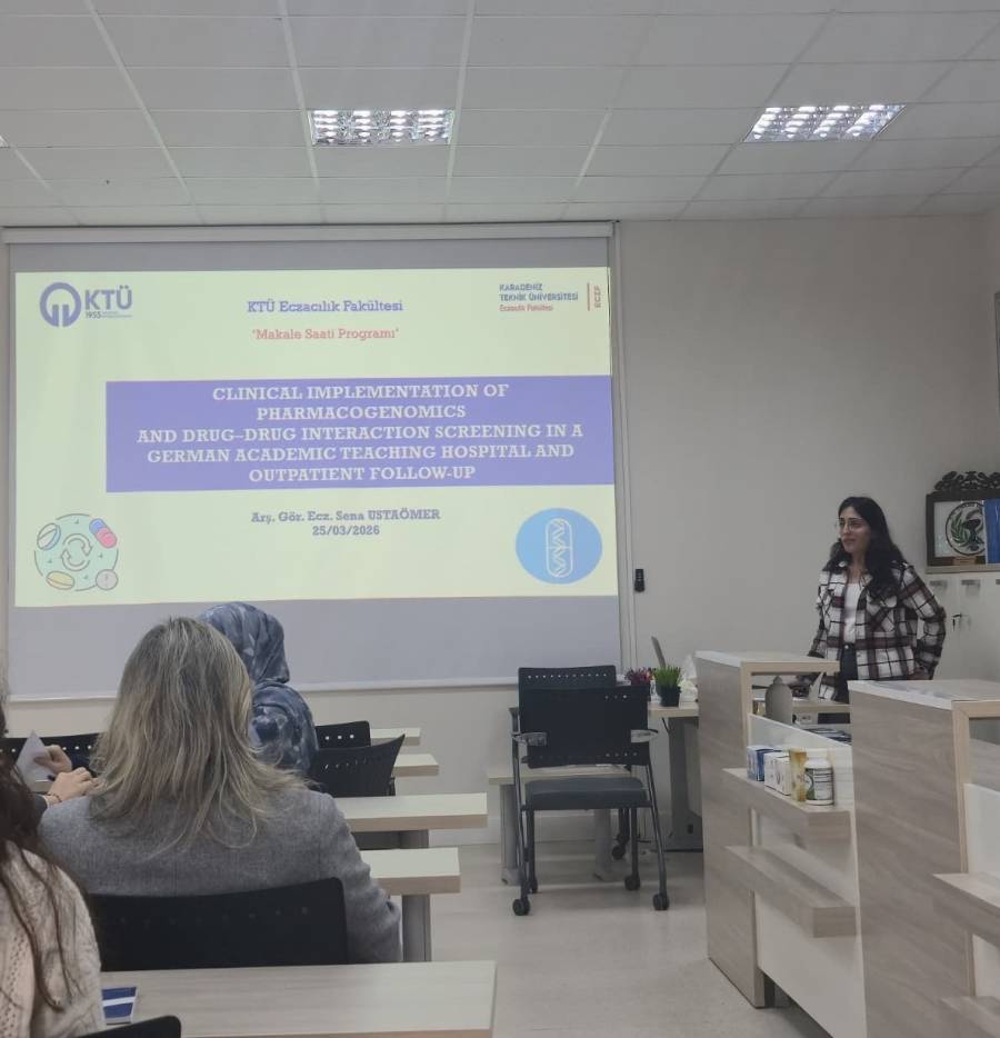 25 Mart 2026 tarihinde Fakültemiz Klinik Eczacılık Ana Bilim Dalı'ndan Arş. Gör. Sena USTAÖMER'in sunumuyla makale saati etkinliği gerçekleştirildi. Sunumun ardından katılımcılarımız, makale hakkında bilimsel değerlendirmeler yaptılar.