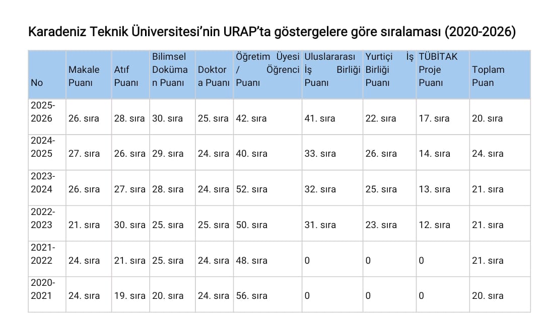 Karadeniz Technical University (KTU) has achieved a remarkable success in the 2025–2026 University Ranking by Academic Performance (URAP) Türkiye Rankings.