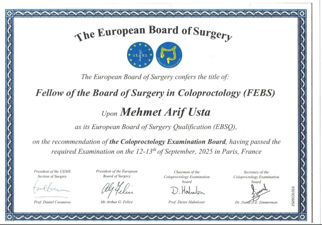 Genel Cerrahi Kliniğimizden Doç. Dr. Mehmet Arif USTA, European Board of Surgery (Avrupa Cerrahi Kurulu) ve Union Européenne des Médecins Spécialistes (Avrupa Tıp Uzmanları Birliği) tarafından 12-13 Eylül 2025 tarihlerinde gerçekleştirilen yeterlilik sınavında gösterdiği başarıyla Avrupa Cerrahi Kurulu – Koloproktoloji Yeterlilik Belgesi (FEBS-C) almaya hak kazanmıştır.