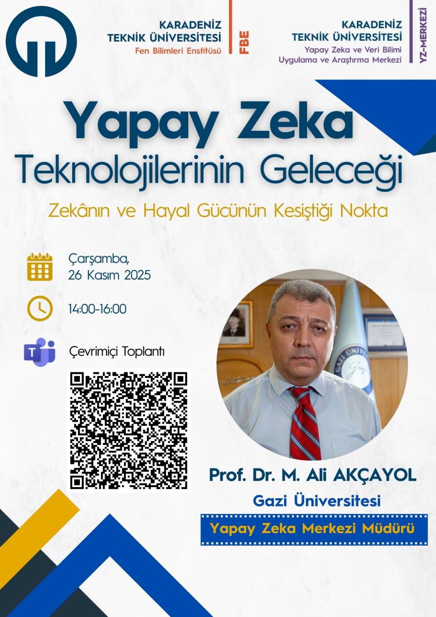 Bu özel etkinlikte, Gazi Üniversitesi Yapay Zeka Merkezi Müdürü Prof. Dr. M. Ali AKÇAYOL, yapay zeka teknolojilerinde güncel gelişmeleri, geleceğin akıllı sistemlerini ve yapay zekâ ile şekillenen yeni dönüşüm alanlarını ele alacaktır.