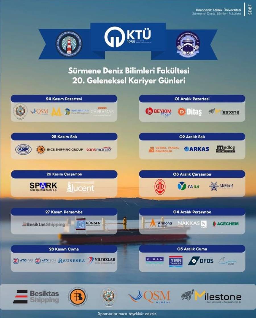 Karadeniz Teknik Üniversitesi Gemi Makineleri İşletme Mühendisliği ve Deniz Ulaştırma İşletme Mühendisliği ev sahipliğinde 24 Kasım - 5 Aralık 2025 tarihleri arasında düzenlenen “20. Kariyer Günleri” etkinliğimiz, sektörün önde gelen isimleri ve öğrencilerin katılımıyla KTÜ Sahil Tesisleri'nde gerçekleştirildi.