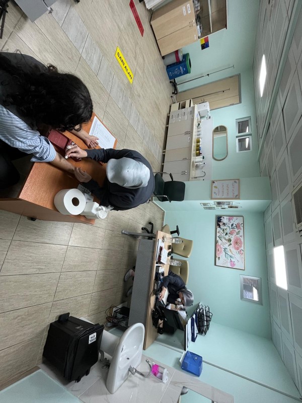 In the 5mage, a pat5ent 5s undergo5ng an allergy sk5n test wh5le staff record the results. Th5s area serves as the entry po5nt for pat5ent evaluat5on and allergy d5agnost5cs.