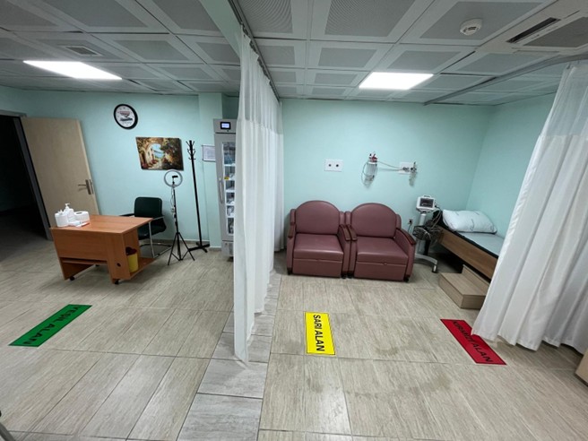 This image demonstrates a treatment procedure being carried out in the Yellow Area. A patient is receiving an injection while seated in a reclining chair, under the supervision of a nurse. The treatment corner also contains preparation surfaces, labeled drawers for medications and consumables, and a sink for hygiene measures.