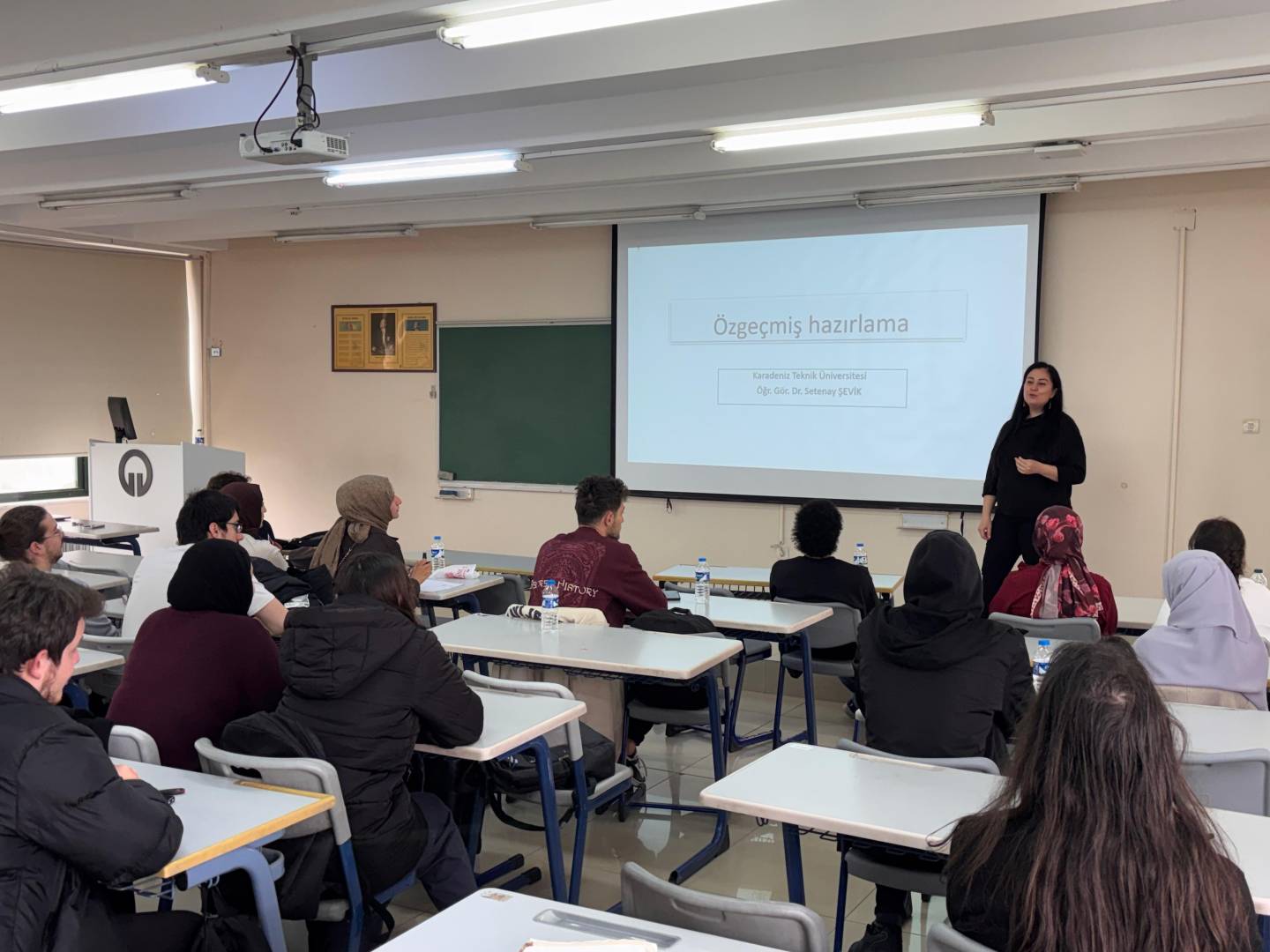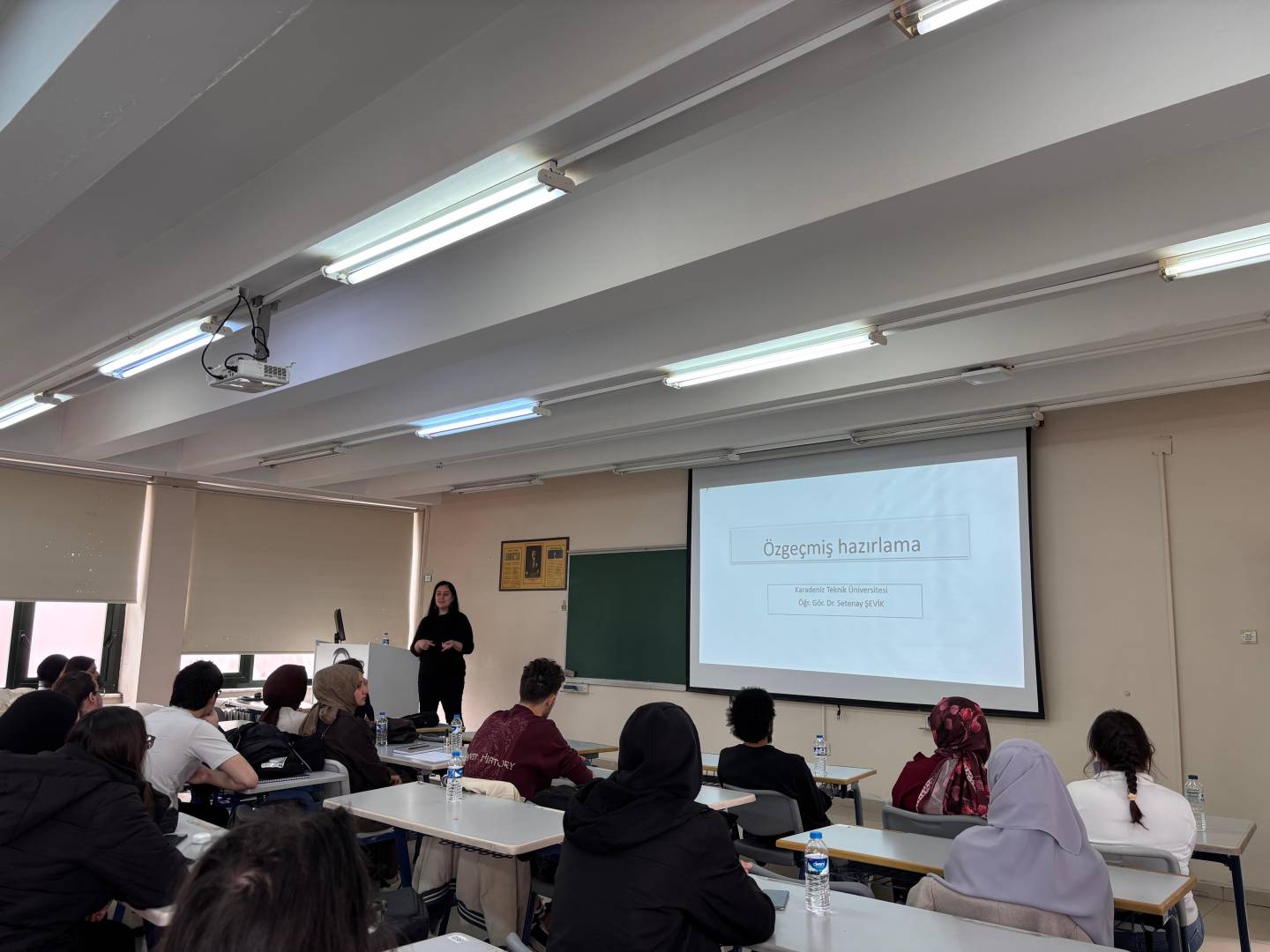 Etkinlik kapsamında, Öğr. Gör. Dr. Setenay ŞEVİK katılımcılarla bir araya gelerek; etkili özgeçmiş hazırlama teknikleri, iş arama süreçlerinde stratejik yaklaşımlar ve kariyer planlamasında dikkat edilmesi gereken noktalar üzerine kapsamlı bilgiler paylaştı.