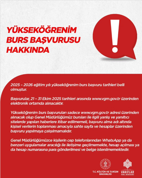 Yükseköğrenim burs başvuruları sadece www.vgm.gov.tr adresi üzerinden alınacak olup Genel Müdürlüğümüz bursları ile ilgili yanlış ve yanıltıcı sitelerde yapılan haberlere itibar edilmemeli, başvuru alma adı altında kişisel verilerin toplanması amacıyla sahte sayfa ve hesaplar üzerinden başvuru yapılmaya çalışılmamalıdır.
