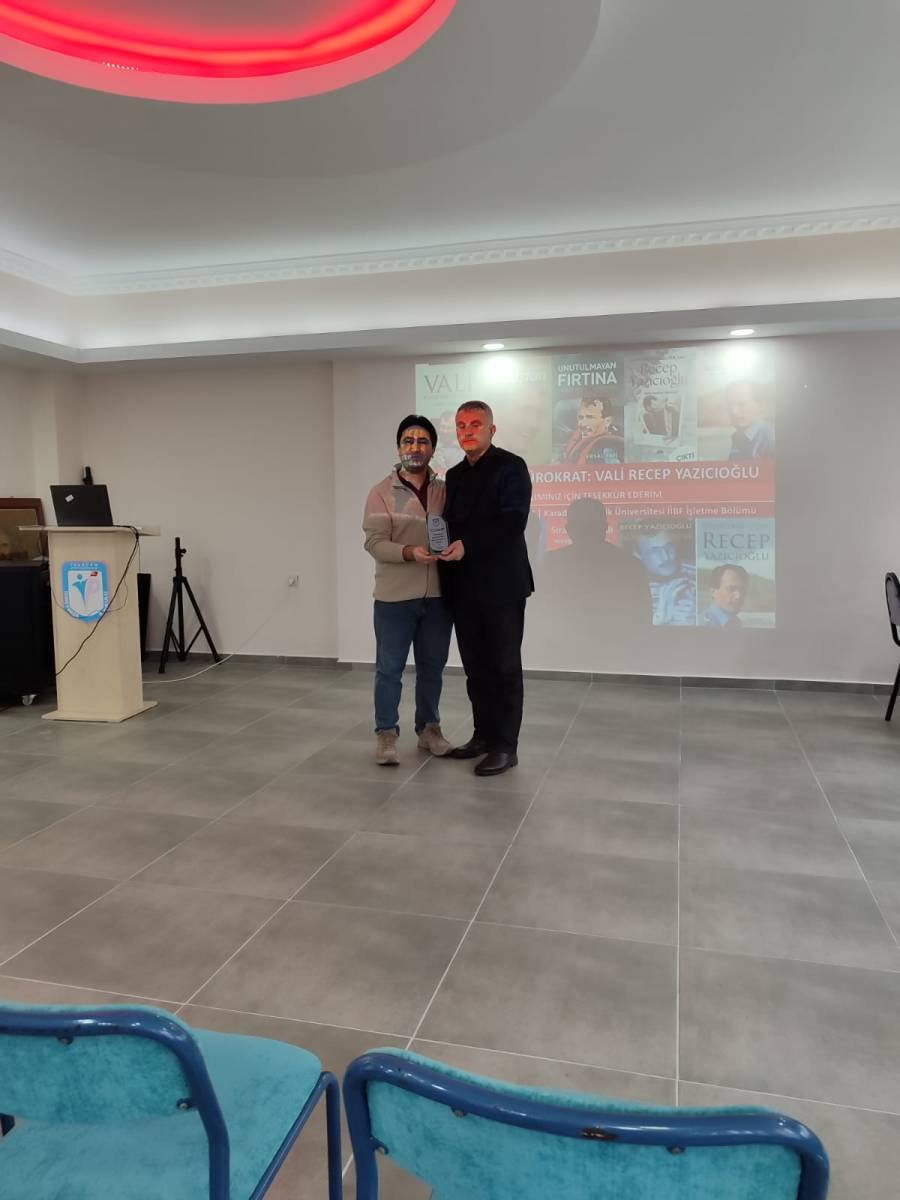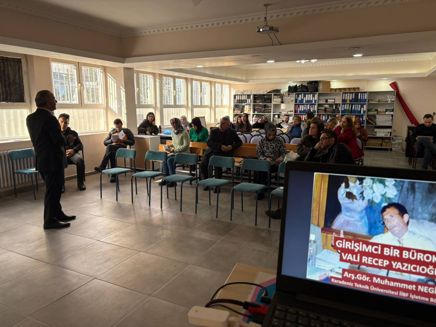 Karadeniz Teknik Üniversitesi İİBF İşletme Bölümü Yönetim ve Organizasyon Anabilim Dalı Araştırma Görevlisi Muhammet Negiz tarafından Ortahisar İsmetpaşa İlkokulu öğretmenlerine "Girişimci Bir Bürokrat: Vali Recep Yazıcıoğlu" başlıklı dönem sonu semineri verildi. Merhum Recep Yazıcıoğlu’nun Tokat, Aydın, Erzincan, Merkez ve Denizli illerini kapsayan valilik dönemi olan 1985-2003 yıllarındaki faaliyetlerinin ele alındığı seminerde bir girişimci bürokratın hayatından alınabilecek dersler değerlendirildi. Araştırma Görevlisi Negiz’in merhum Vali’ye dair arşiv incelemeleri ve mülakatlar neticesinde ulaştığı bilgi ve belgeler öğretmenlere sunuldu.