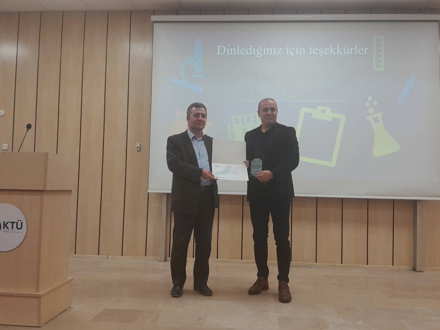 "Bilginin topluma yayılması amacıyla düzenlenen/icra edilen faaliyet sayısı kapsamında" KTÜ Kimya Bölümü Yönetimi olarak öğrencilerimiz için İş Sağlığı ve Güvenliği Eğitimi düzenledik. İş Sağlığı ve Güvenliği Anabilim Dalı Başkanı Prof. Dr. Tayfun Dede, 03 Aralık 2025 tarihinde saat 15.00’te Nazım Terzioğlu Amfisinde bölümümüz öğrencilerine yönelik "Eğitim ve Laboratuvar Çalışmalarında İş Sağlığı ve Güvenliği" başlıklı kapsamlı bir seminer verdi.