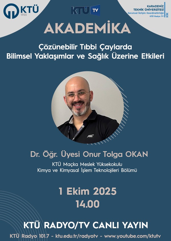 Maçka Meslek Yüksekokulu Kimya ve Kimyasal İşleme Teknolojileri bölümü öğretim elemanı Dr. Öğretim Üyesi Onur Tolga OKAN, KTÜ Tv'de Akademika programının canlı yayın konuğu oldu. "Çözünebilir Tıbbi Çaylarda Bilimsel Yaklaşımlar ve Sağlık Üzerine Etkileri" konulu bir söyleşi gerçekleştirilen programda verdikleri değerli bilgiler için Hocamıza Teşekkür ediyoruz.
