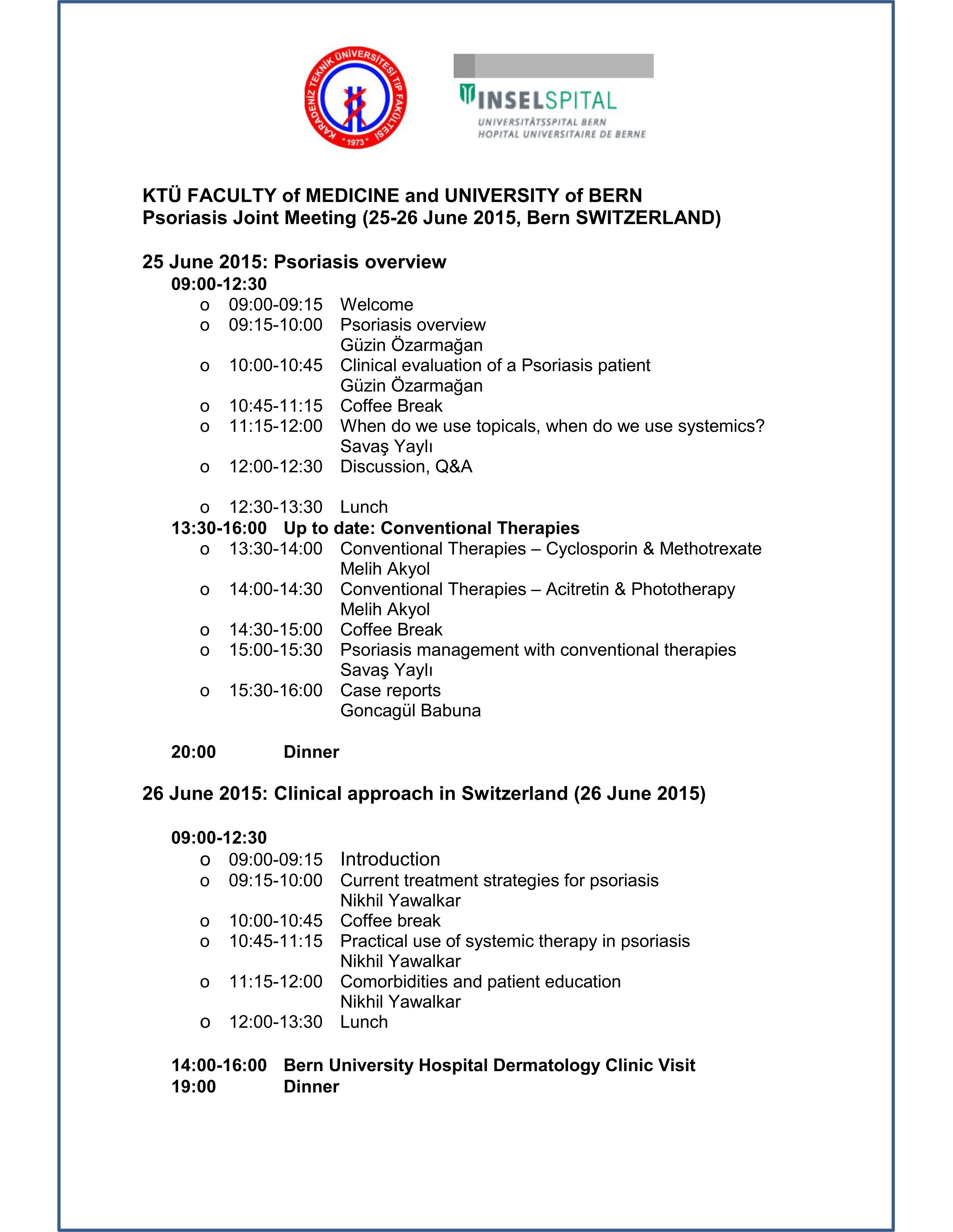 Karadeniz Teknik Üniversitesi Tıp Fakültesi Dermatoloji AD ile Bern Üniversitesi Tıp Fakültesi Dermatoloji AD, 25-26 Haziran 2015 tarihlerinde İsviçre'nin Bern şehrinde, Dermatoloji Uzmanlarının katılacağı bir Psoriasis toplantısı düzenlemişlerdir. Ekte bilimsel programa ulaşabilirsiniz.