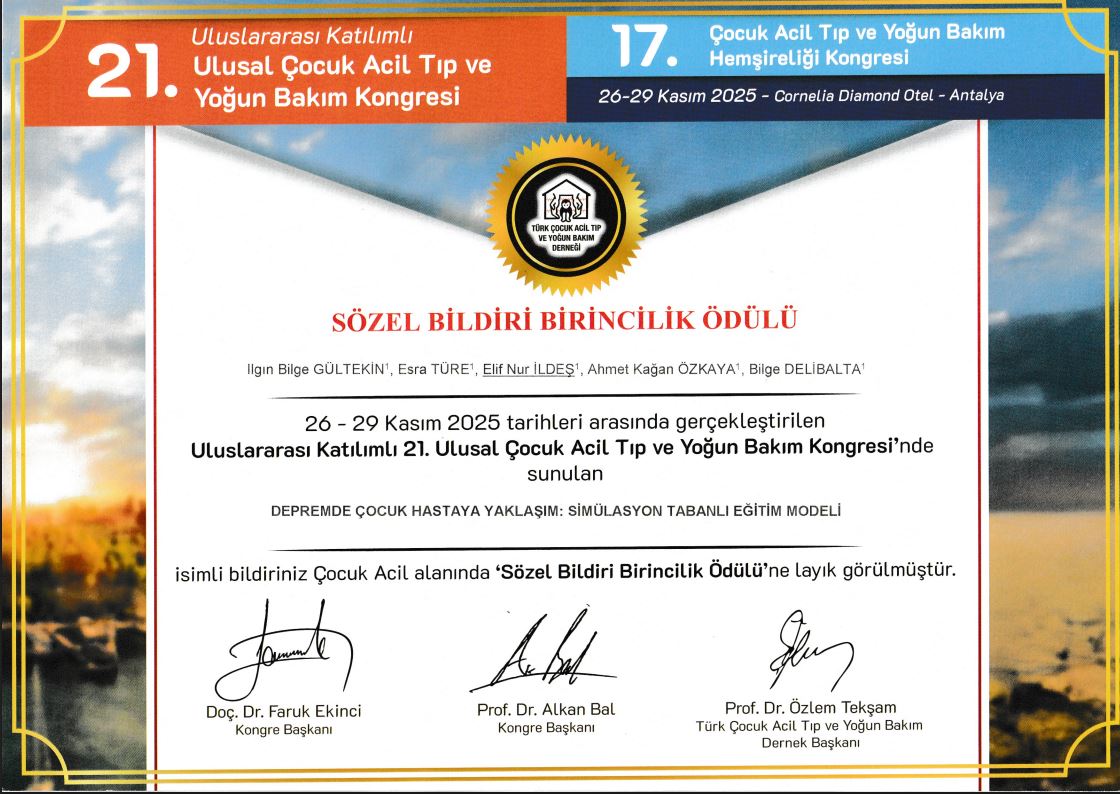 Türk Çocuk Acil Tıp ve Yoğun Bakım Derneği tarafından 26-29 Kasım 2025 tarihleri arasında gerçekleştirilen; Uluslararası Katılımlı 21. Ulusal Çocuk Acil Tıp ve Yoğun Bakım Kongresi ve 17. Çocuk Acil Tıp ve Yoğun Bakım Hemşireliği Kongresi'nde Fakültemiz Çocuk Acil Tıp Bilim Dalı Öğretim Üyesi Doç. Dr. Esra TÜRE ve çalışma arkadaşları "Depremde Çocuk Hastaya Yaklaşım: Simülasyon Tabanlı Eğitim Modeli" isimli çalışma ile sözel bildiri birincilik ödülü kazandı.