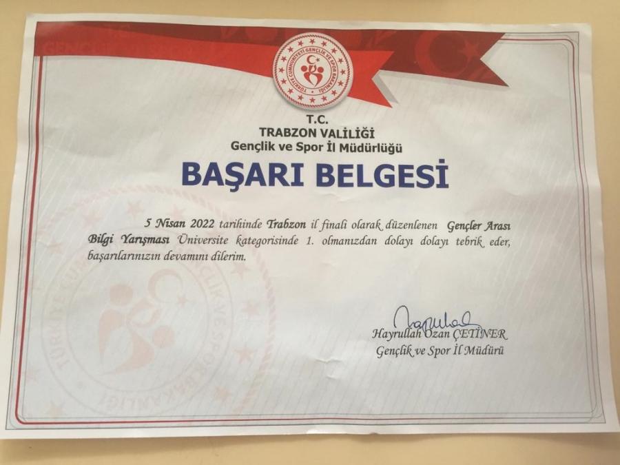 05.04.2022 tarihinde Gençlik ve Spor Bakanlığının düzenlemiş olduğu Türkiye geneli Gençler Arası Bilgi Yarışmasında Dönem 6 öğrencilerimizden Beyza Nur Yazıcı ve Süeda Bıyıkoğlu, Dönem 4 öğrencilerimizden Müberra Taşan'dan oluşan grup Trabzon ilinde birinci olup, ili temsilen Samsun'da yapılacak olan bölge finallerine katılmaya hak kazandılar.