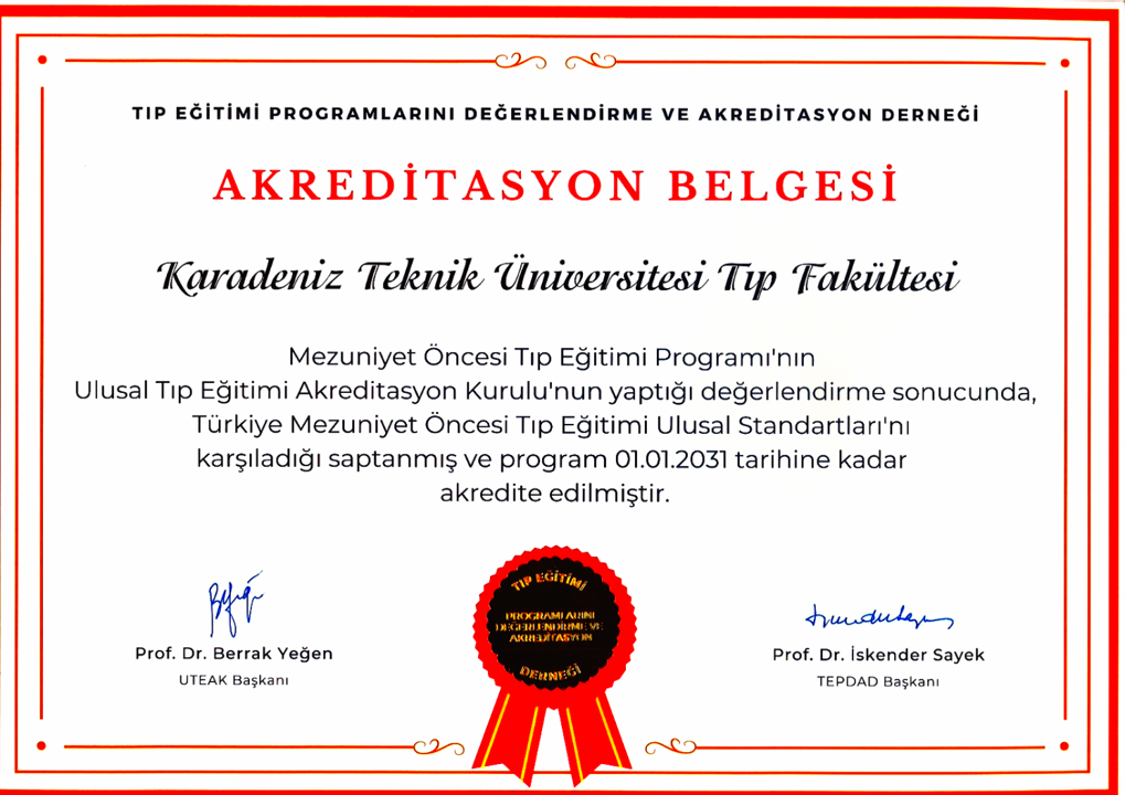 Fakültemiz Mezuniyet Öncesi Tıp Eğitimi, Uluslararası Akreditasyona sahip olan Tıp Eğitimi Programlarını Değerlendirme ve Akreditasyon Derneği (TEPDAD) tarafından, 01.01.2013 tarihinde itibaren akredite edilmiş olup, halen akredite bir tıp fakültesi olarak eğitimini sürdürmektedir.