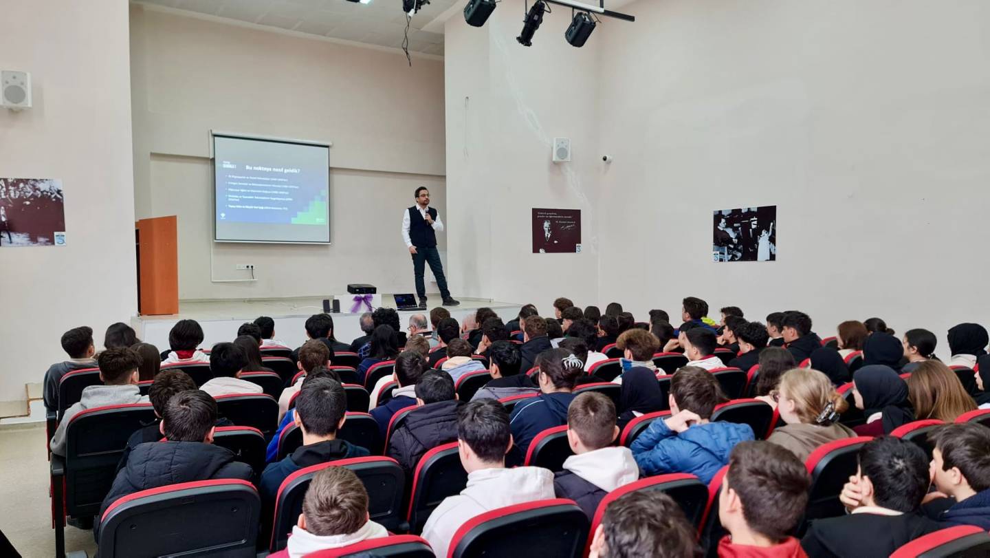 The talk covered the fundamental concepts of artificial intelligence, its applications in daily life, and the transformation it will create in the fields of education, health, security, and technology in the future. Students had the opportunity to learn how artificial intelligence technologies work and how they will shape the professions of the future.