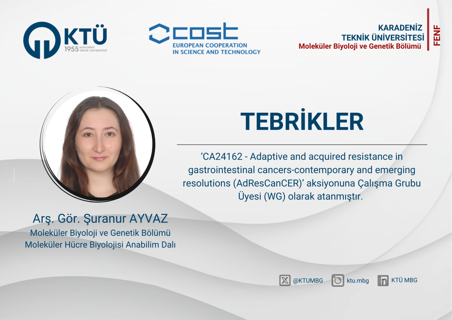 Bölümümüz öğretim elemanlarından Arş. Gör. Şuranur AYVAZ 'CA24162 - Adaptive and acquired resistance in gastrointestinal cancers-contemporary and emerging resolutions (AdResCanCER)' aksiyonuna Çalışma Grubu Üyesi (WG) olarak atanmıştır.