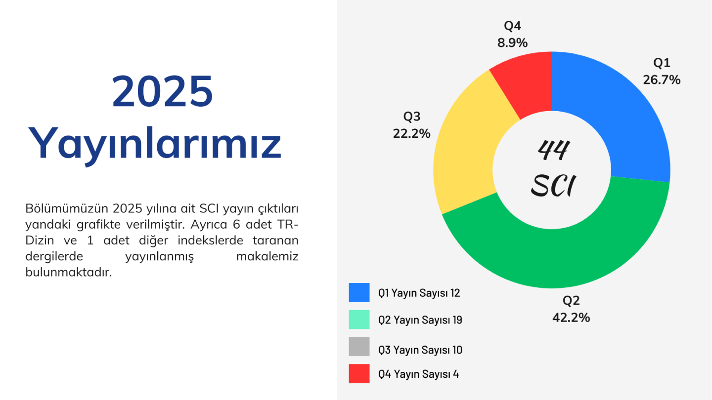 Bölümümüz, 2025 yılı boyunca yürüttüğü bilimsel çalışmalar sonucunda ulusal ve uluslararası düzeyde önemli akademik çıktılar elde etmiştir. Bu kapsamda, yıl içerisinde toplam 51 makale yayımlanmış olup, bunların 44’ü SCI, 6’sı TR Dizin ve 1’i Scopus kapsamındaki dergilerde yer almıştır. SCI indeksli yayınlarımızın önemli bir bölümünün Q1 ve Q2 quartile gruplarında yer alması, bölümümüzün yüksek etki faktörlü ve nitelikli yayın üretme anlayışını ortaya koymaktadır.