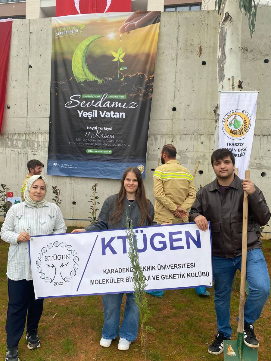 Karadeniz Teknik Üniversitesi Moleküler Biyoloji ve Genetik Bölümü öğrencileri, sosyal sorumluluk projesi kapsamında 11 Kasım Milli Ağaçlandırma Günü dolayısıyla anlamlı bir etkinliğe imza attı. KTÜGEN öğrenci kulübü iş birliğiyle düzenlenen etkinlikte, Orman Genel Müdürlüğü tarafından ağaç dikim alanı olarak belirlenen Trabzon İl Jandarma Komutanlığı bahçesinde fidan dikimi gerçekleştirildi. Etkinlik kapsamında bölüm öğrencileri, bölüm ve öğrenci kulübü adına fidan sahiplenerek doğaya katkı sundu. Öğrenciler, çevre bilincinin artırılması ve sürdürülebilir bir gelecek için farkındalık oluşturmayı amaçladıkları bu etkinlikte doğayla iç içe keyifli bir gün geçirdiler.
