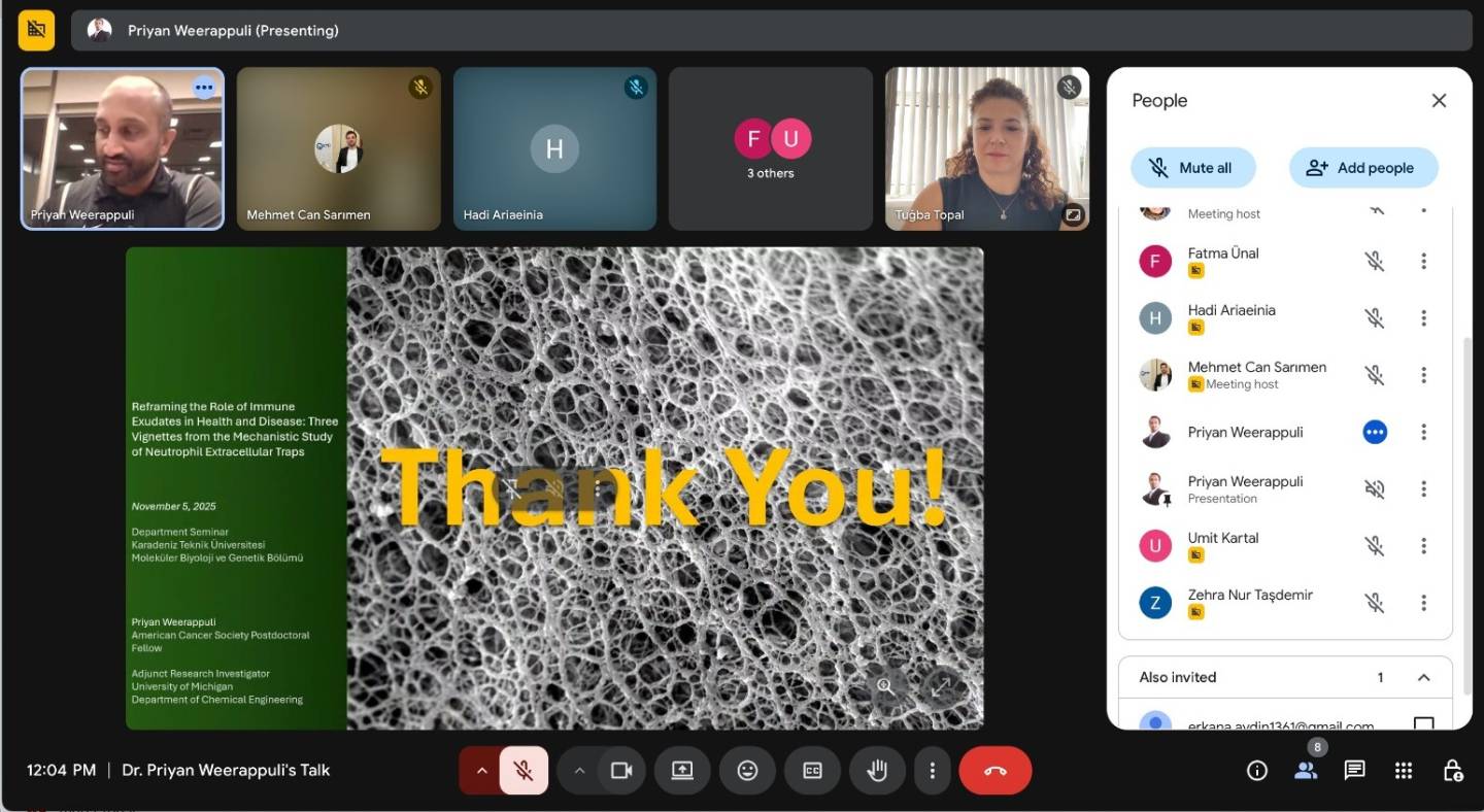 Karadeniz Teknik Üniversitesi Moleküler Biyoloji ve Genetik Bölümü tarafından 5 Kasım 2025 tarihinde düzenlenen çevrimiçi seminerde, Michigan Üniversitesi Kimya Mühendisliği Bölümü’nden Dr. Priyan Weerappuli konuk edildi.