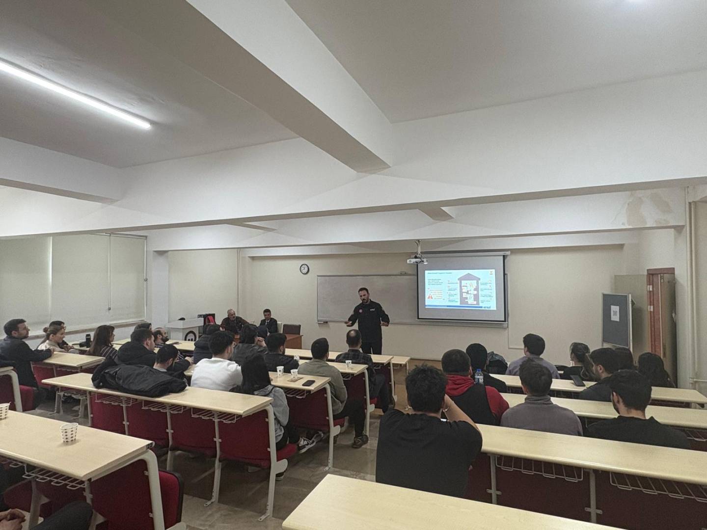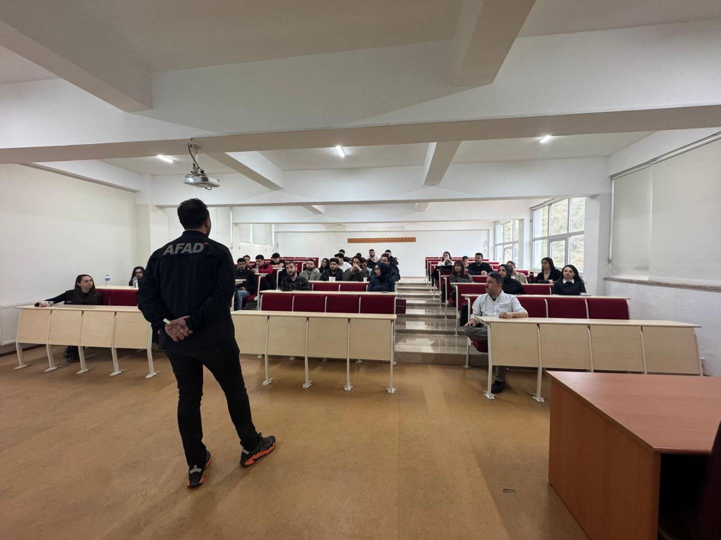 AFAD işbirliğiyle düzenlenen "Afet Farkındalık Eğitimi" ile afet öncesi alınması gereken tedbirler, afet sırasındaki doğru davranış modelleri ve afet sonrası ilk saatlerin önemi üzerinde durulmuştur. Derslik-5’te gerçekleştirilen bu eğitimle, afetlerle mücadelenin sadece teknik mühendislik çözümleriyle değil, aynı zamanda bireysel farkındalıkla mümkün olduğu belirtilmiştir.