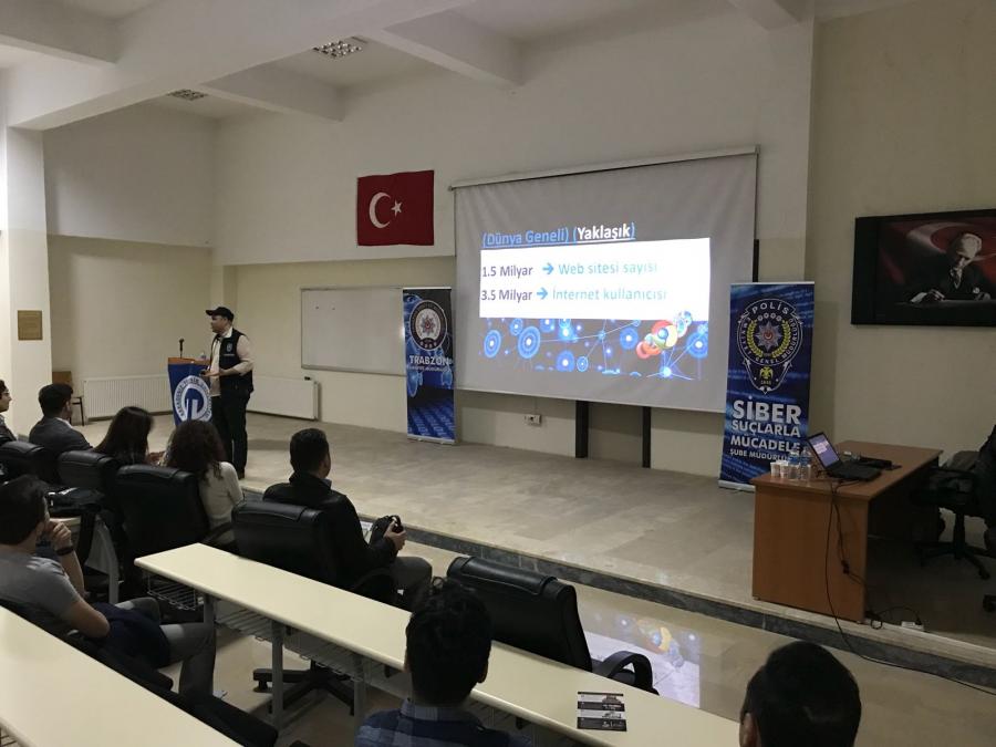 Trabzon emniyet müdürlüğü siber suçlarla mücadele biriminden fakültemiz öğrenci, akademik ve idari personeline yönelik olarak güvenli internet, bilişim suçları ve siber güvenlikle işgili seminer verildi. Çok verimli geçen seminer için il emniyet müdürlüğümüze ve sunumları yapan değerli personeline fakültemiz adına teşekkür ederiz.