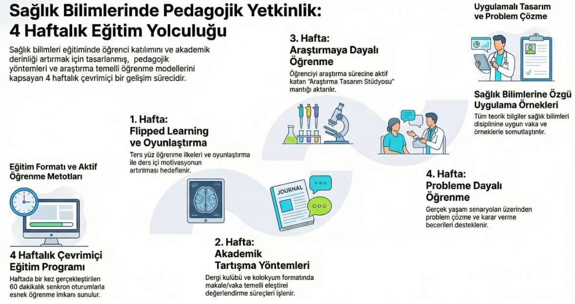 Sağlık Bilimlerinde Pedagojik Yetkinlik Geliştirme Programı, lisansüstü düzeyde ders veren akademisyenlerin çağdaş öğretim yaklaşımlarını sağlık bilimleri bağlamında daha etkili, planlı ve öğrenci merkezli biçimde kullanabilmelerini desteklemek amacıyla hazırlanmıştır.