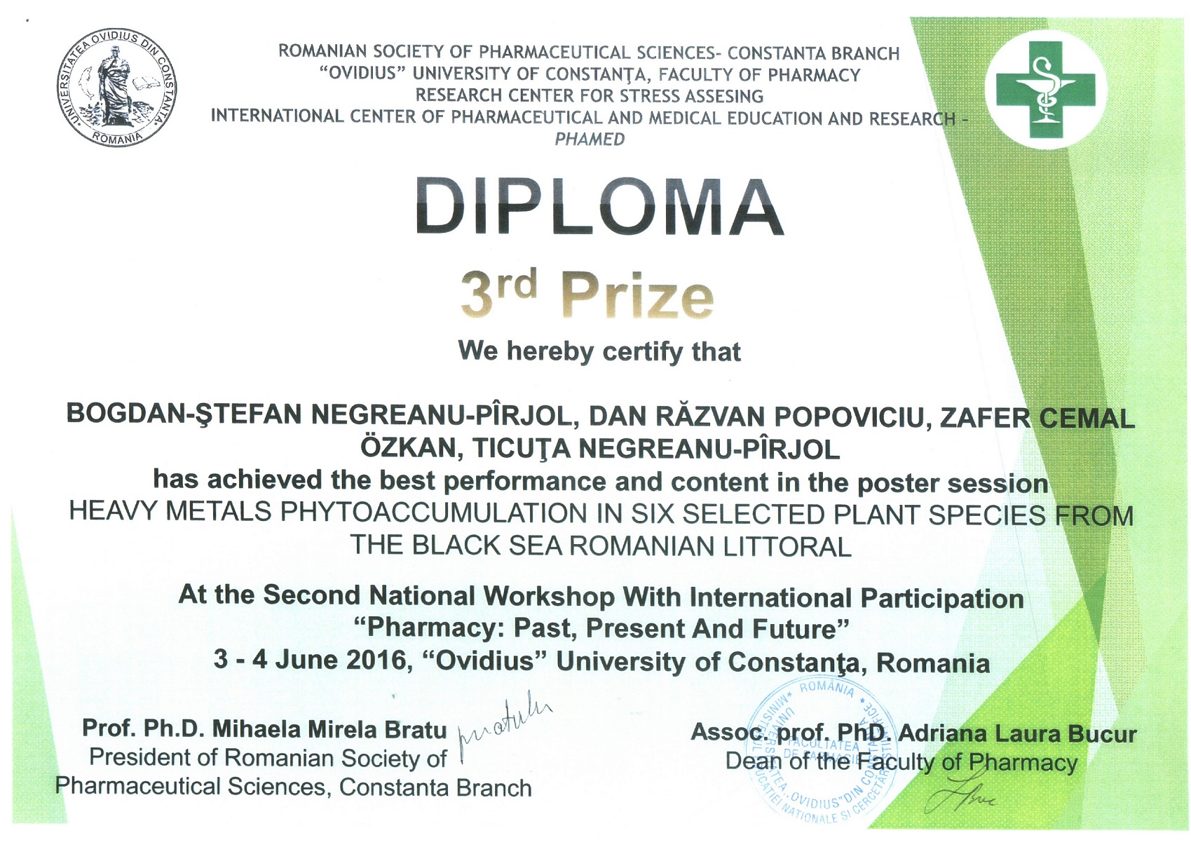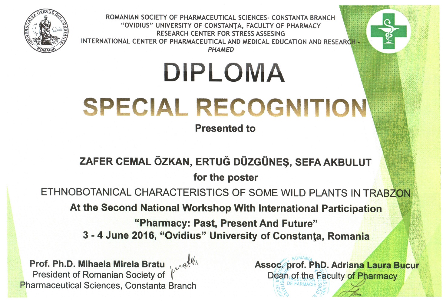 "Bölümümüz öğretim üyelerinden Prof. Dr. Zafer Cemal ÖZKAN ve Yrd. Doç.Dr. Sefa AKBULUT tarafından hazırlanan poster bildiri Romanya'da 3-4 Haziran 2016 tarihlerinde gerçekleştirilen "Second National Workshop With International Participation- Pharmacy: Past, Present And Future" adlı çalıştayda özel ödüle layık görülmüştür. Aynı çalıştayda Prof. Dr. Zafer Cemal ÖZKAN'ında yer aldığı bir başka poster ise Üçüncülük Ödülü almıştır.