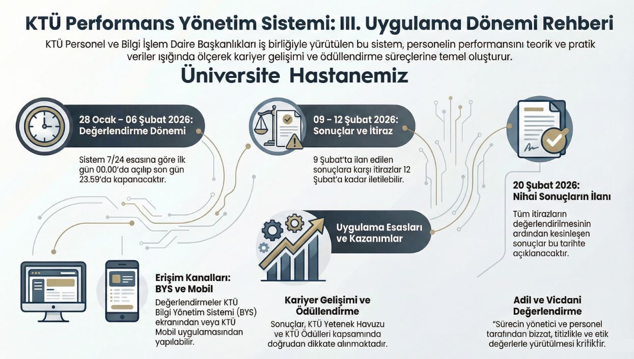 Farabi Hastanesi Başhekimliğinde üçüncü uygulama dönemi performans değerlendirme takvimine göre 28.01.2026-06.02.2026 tarihleri arasında belirlenmiştir. Performans Yönetim Sistemi 7/24 esasına göre çalışmakta olup ilgili başlangıç tarihinde saat 00.00’da sistem açılacak ve bitiş tarihinde saat 23.59’da sistem kapanacaktır.